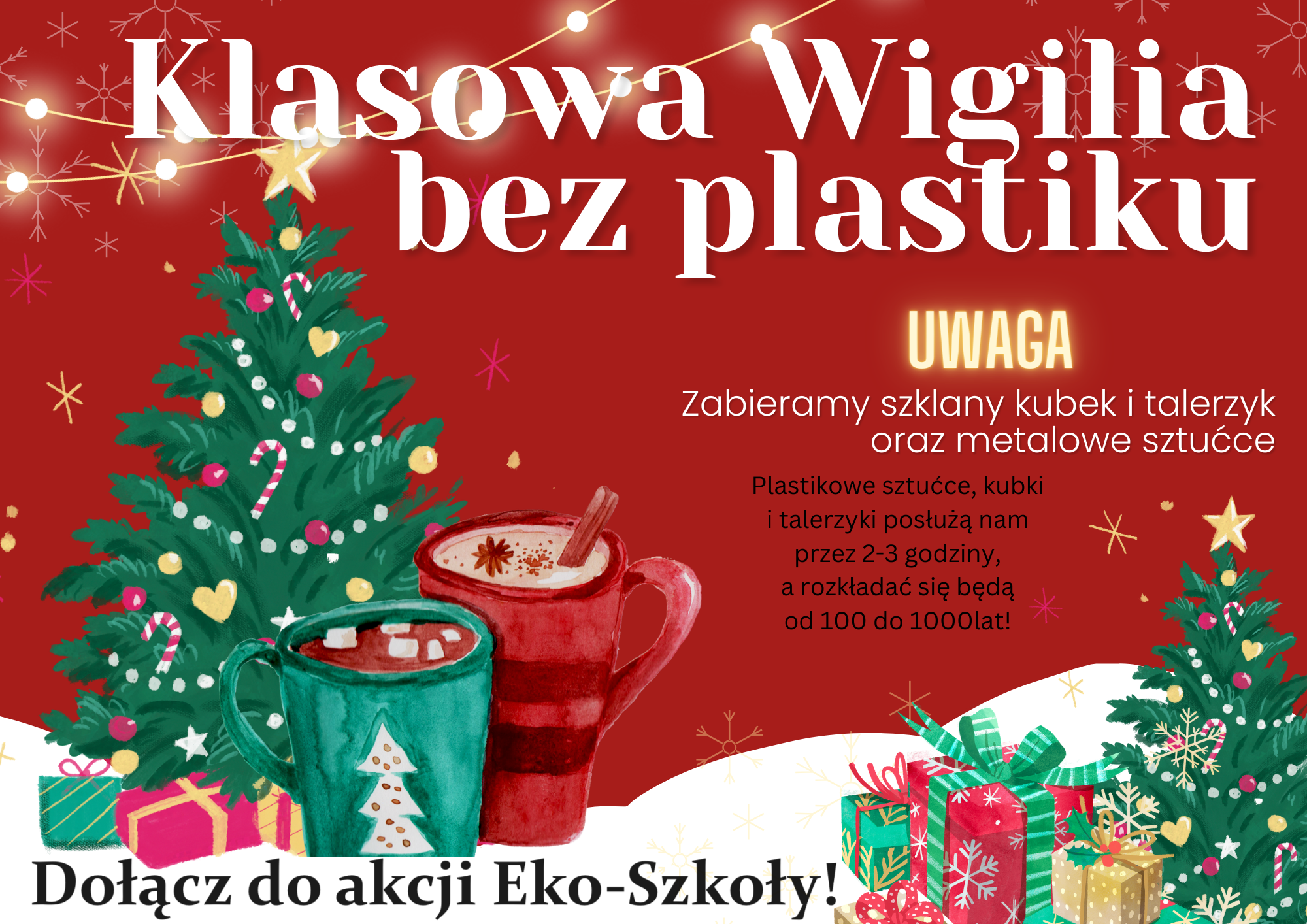 „Klasowa Wigilia bez plastiku” -ogólnopolska akcja mająca na celu ograniczenie ilości plastikowych odpadów. Faktem jest, że plastikowe talerzyki, kubeczki czy sztućce, używane są zaledwie przez 2-3 godziny, a w środowisku rozkładać mogą się od 100 do 1000 lat. Akcja Eko-Szkoły pozytywnie wpłynęła na świadomość ekologiczną uczniów. Dziękujemy wszystkim klasom biorącym udział w tak ważnym przedsięwzięciu.